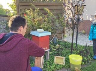 Und dann war es endlich so weit. Nachdem die Seepferdchen ankamen, wurden sie in zwei Gruppen eingeteilt. Die eine Gruppe durfte als erstes in den Bienenstock schauen. Dort erfuhren sie nicht nur die Aufgaben der verschiedenen Bienen, sondern auch wie sie zusammenleben. Besonders freuten sie sich, dass sie auch die Bienenkönigin in der Vielzahl der Arbeitsbienen entdecken konnten. Außerdem konnten sie sehen und beobachten, wie die Flugbienen den Nektar in die Waben einbringen und sie daraus den Honig herstellen.