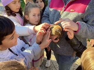 Und dann wollten die Kinder sie endlich sehen. Die vielen unterschiedlichen Hühner. Die Kinder konnten beobachten, wie sie fressen, gackern und umherlaufen. Natürlich konnten sie auch eine Wachtel und ein Huhn anfassen und die unterschiedlichen Federn streicheln.
