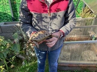Und dann waren da auch noch die Schildkröten. Davon waren die Kinder sehr begeistert. Diese bereiten sich zurzeit schon auf ihre Winterstarre vor. Vor kurzem haben sie das Fressen eingestellt und sind gerade dabei ihren Körper herunter zu kühlen. Bald werden sie sich im Frühbeet einen Platz suchen und sich unter die Erde graben. Dort schlafen sie dann bis zum nächsten Frühjahr. Schildkröte „Otto“ war aber bereit sich den Kindern zu zeigen. Sie sahen und fühlten den harten Panzer und die lederartigen Beine, die an vier Stellen aus dem Panzer herausragten.