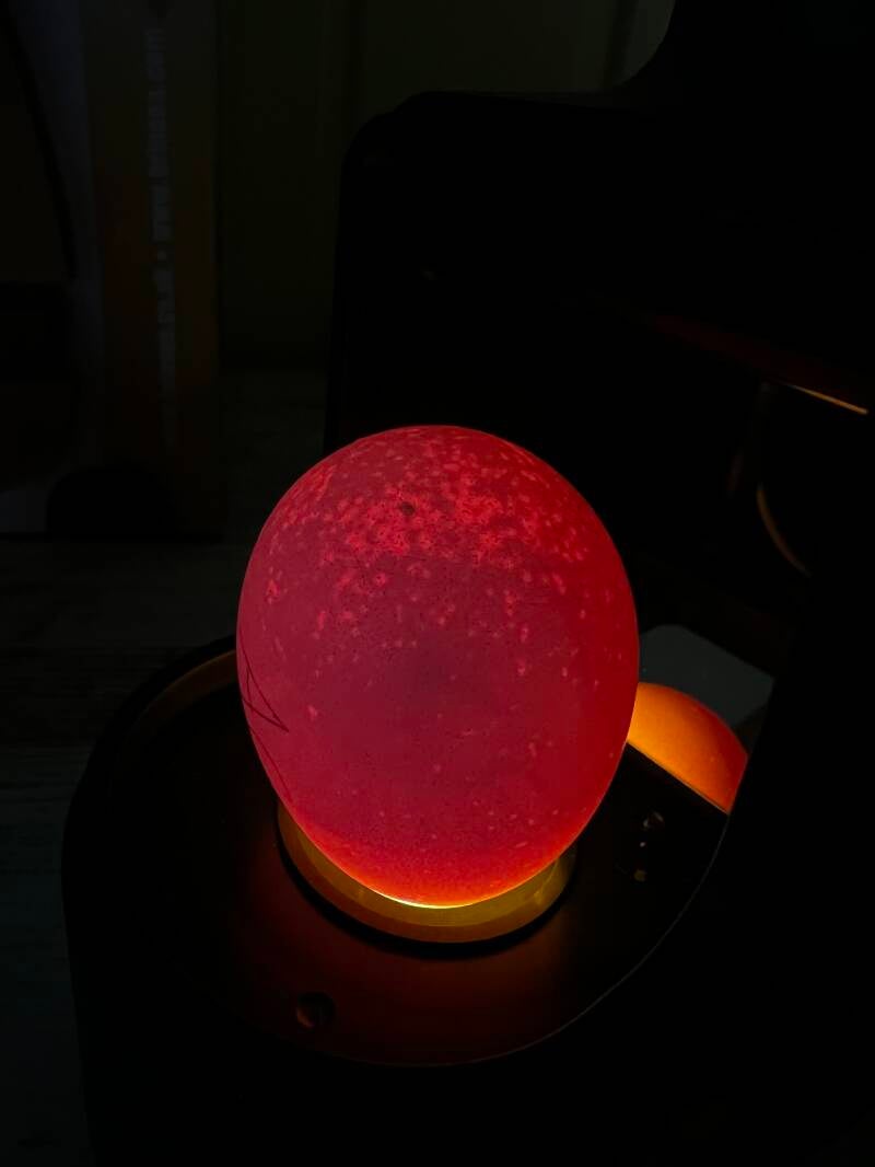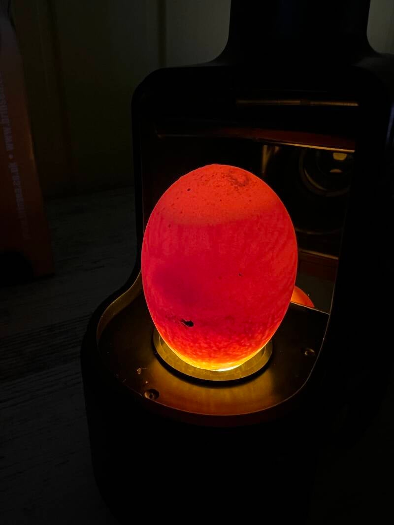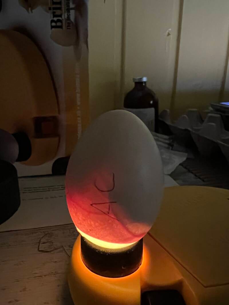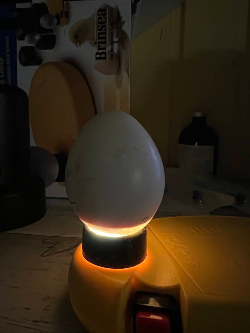 Die Eier wurden noch einmal alle durchgeschiert, um die Entwicklung zu beobachten und abgestorbene oder unbefruchtete Eier aus dem Brutautomat zu nehmen. Lässt man sie weiter bebrüten, kann es sein, dass sie Faulgase bilden und platzen. Dies kann die befruchteten Eier gefährden.