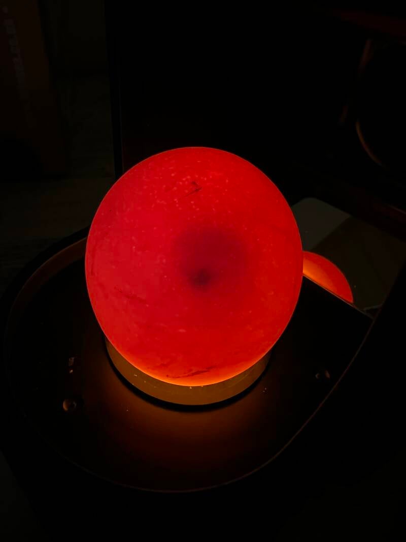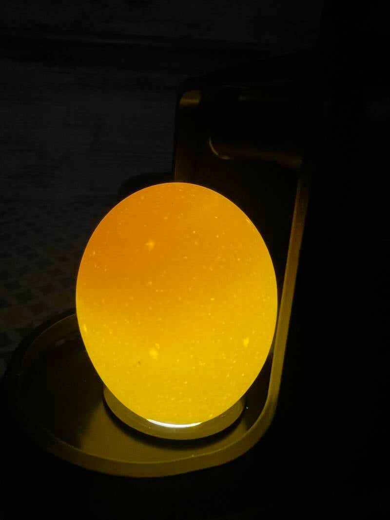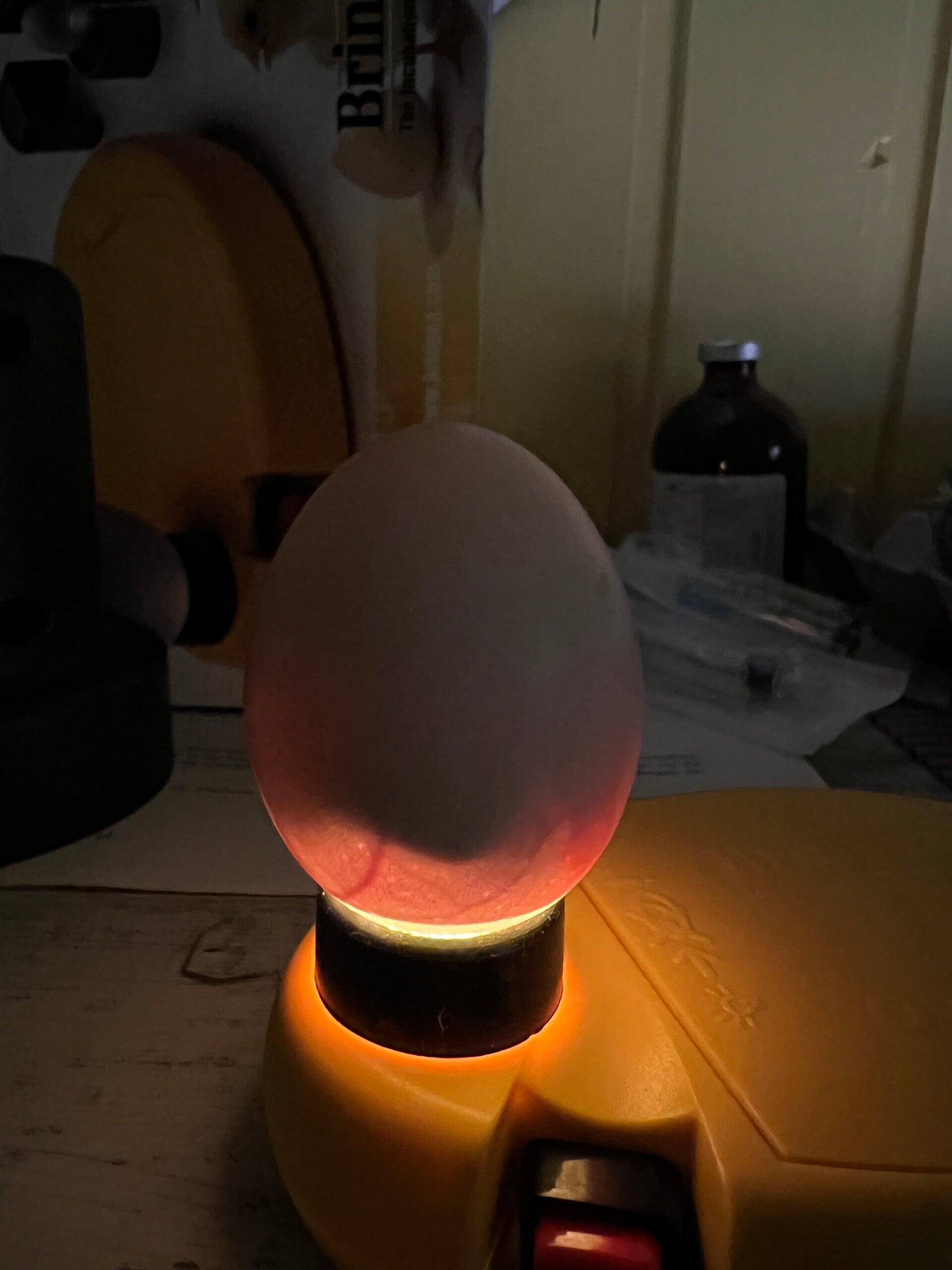 Die Eier wurden noch einmal alle durchgeschiert, um die Entwicklung zu beobachten und abgestorbene oder unbefruchtete Eier aus dem Brutautomat zu nehmen. Lässt man sie weiter bebrüten, kann es sein, dass sie Faulgase bilden und platzen. Dies kann die befruchteten Eier gefährden.
