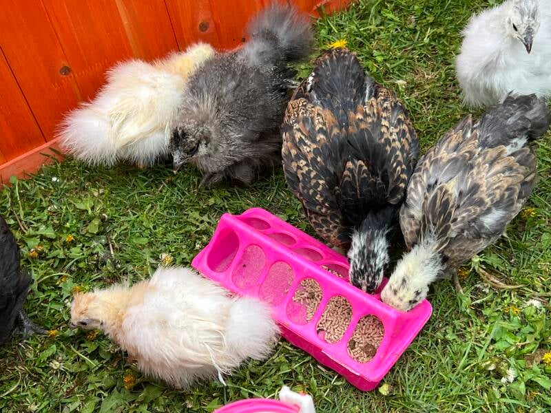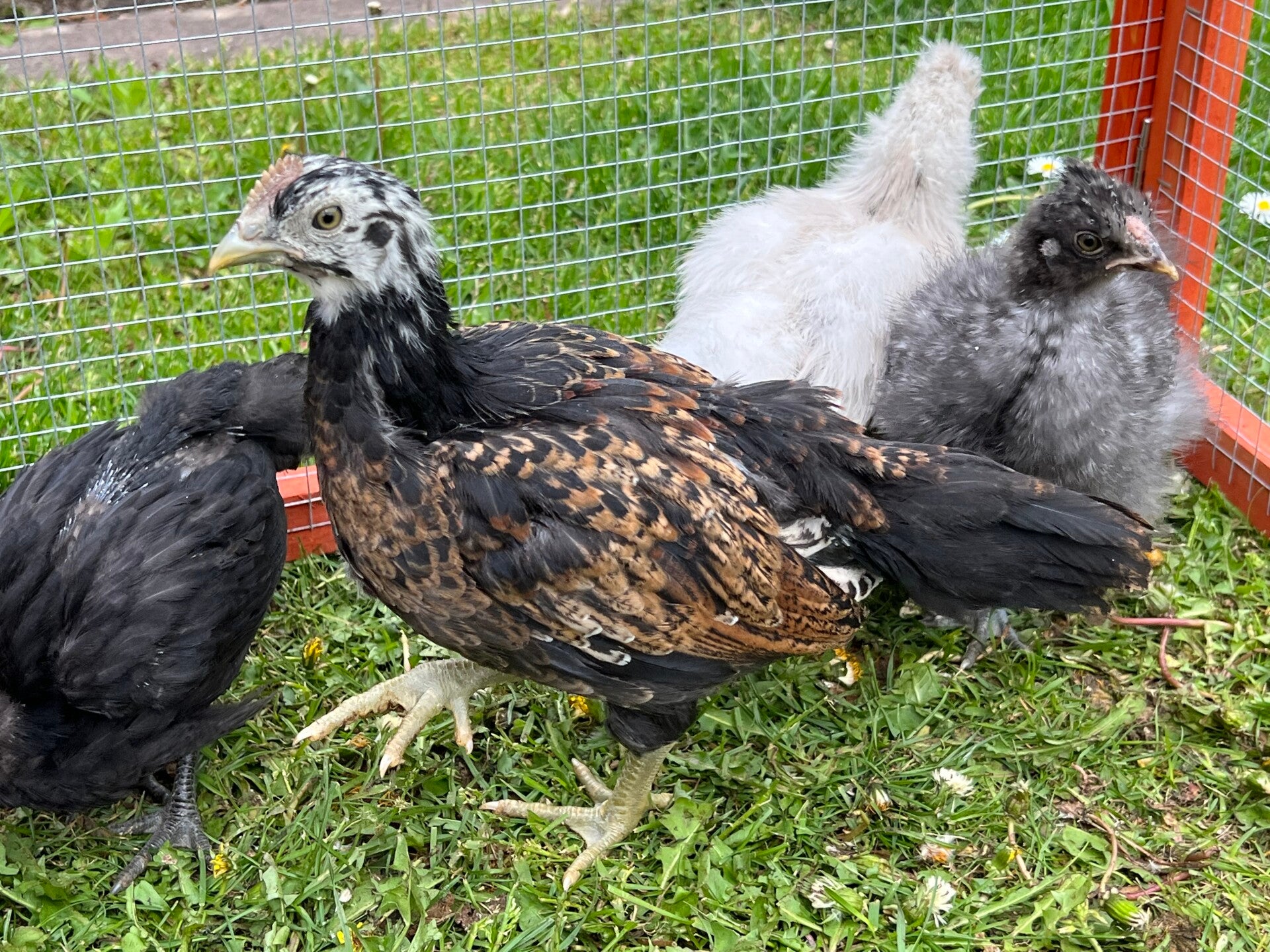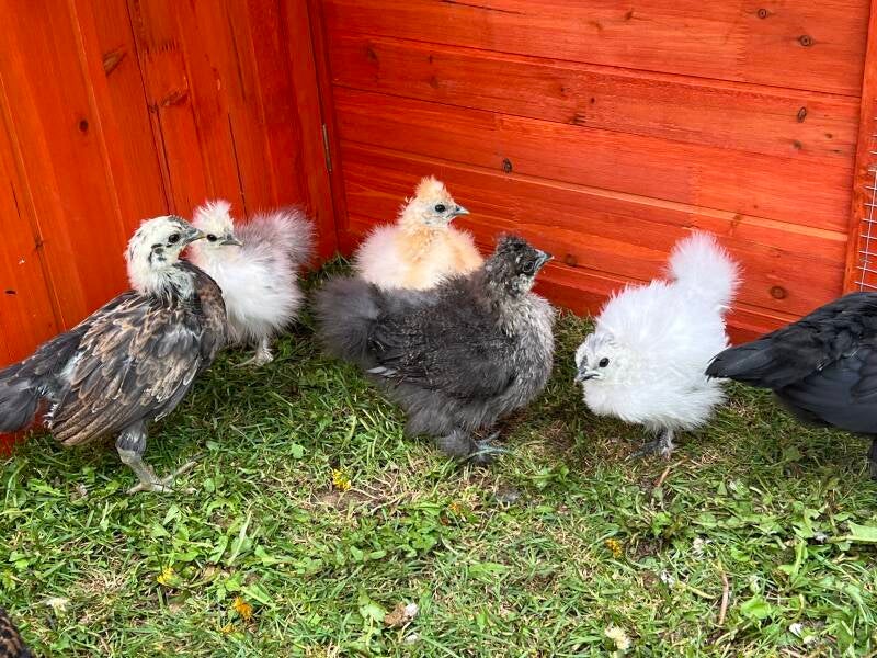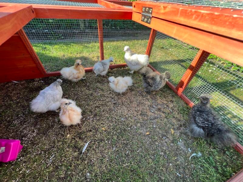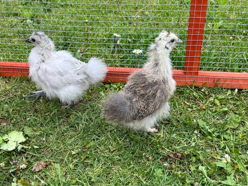 Das Gefieder ist mittlerweile fast durchgewechselt, das heißt, der Kükenflaum ist weg und sie haben schon richtige Federn angelegt, bzw. die Seidenküken ihre "Seidenfedern". Da das Wetter auch jeden Tag schön ist, dürfen sie nun am Tag in den Auslauf auf den Rasen.