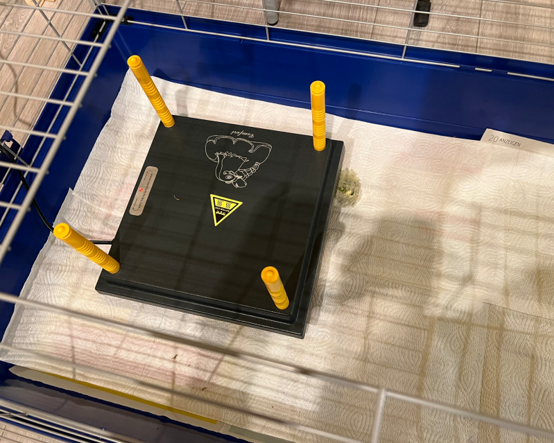 Hierzu nahmen wir einen Kleintierkäfig, ausgelegt mit Zeitung und Küchenrolle, sowie einer Heizplatte oder auch künstliche Glucke genannt, unter der sich die Küken direkt verstecken konnten.