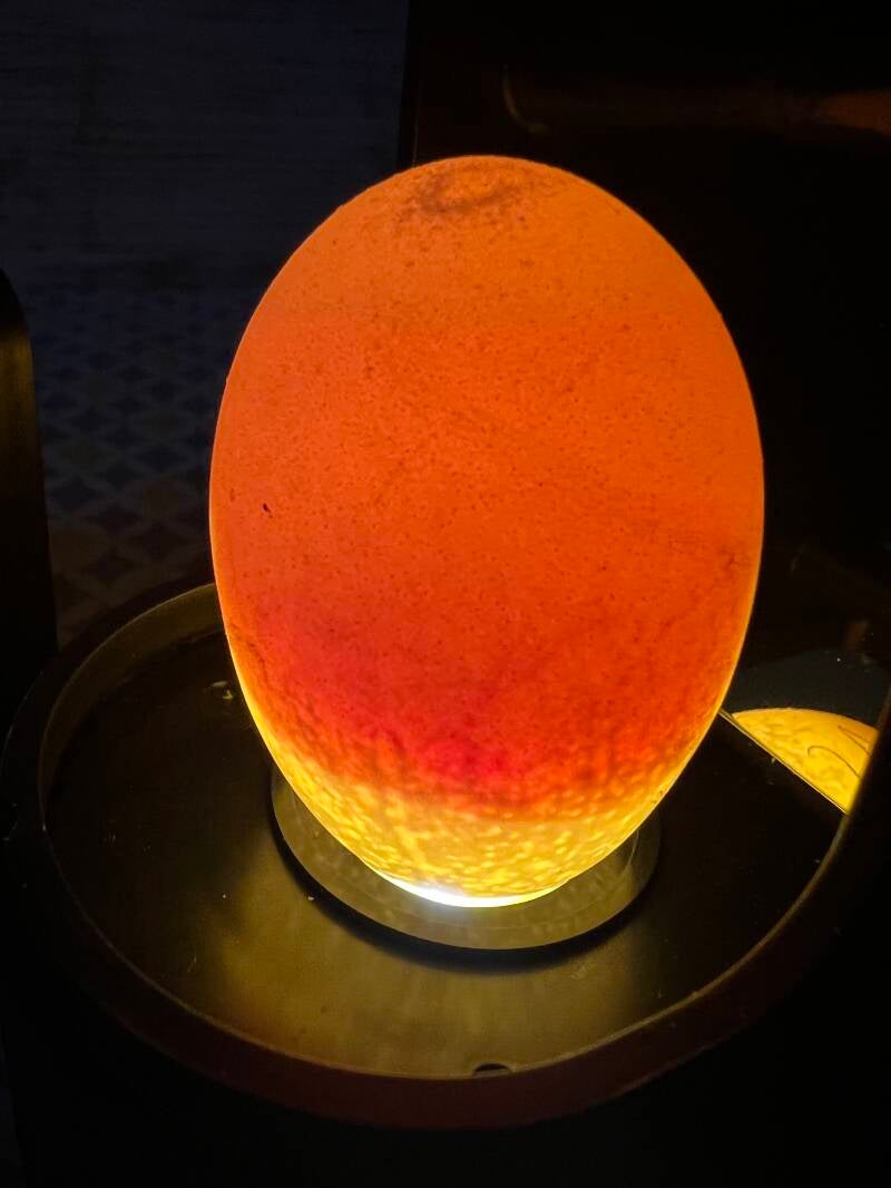 Man kann deutlich erkennen, dass das komplette Ei mit dem Küken ausgefüllt ist. Ganz unten befindet sich die Luftblase. Die Küken haben sich so im Ei gedreht, dass sie mit dem Schnabel als erstes in die Luftblase einstechen. Dort befindet sich ein Sauerstoffvorrat, der bis zum endgültigen Durchstoßen der Eischale reichen wird.