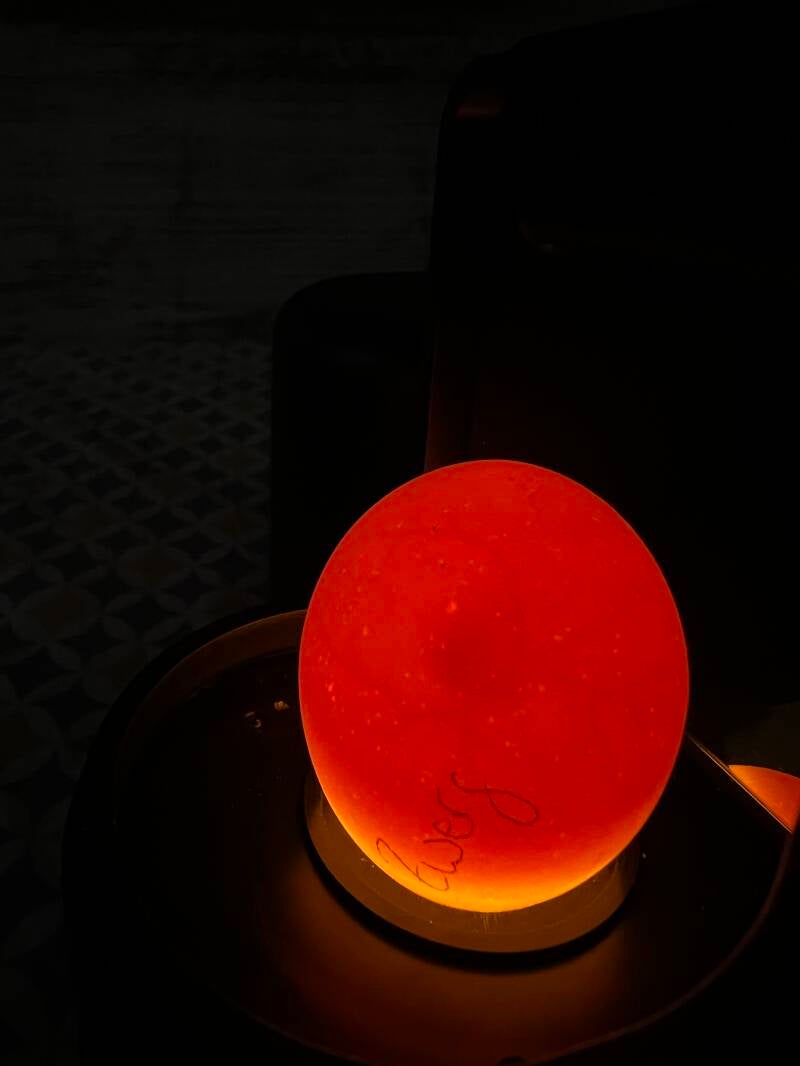 Heute wollten wir zum ersten Mal die Eier schieren, das heißt die Eier werden durchleuchtet, um zu schauen ob sie befruchtet sind.