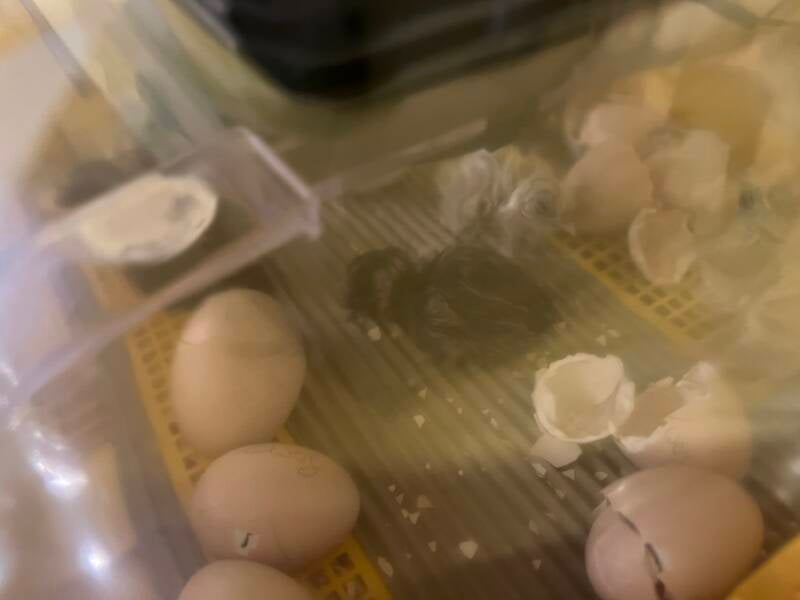 Noch vier Eier lagen im Brüter. Zwei waren bereits angepickt.