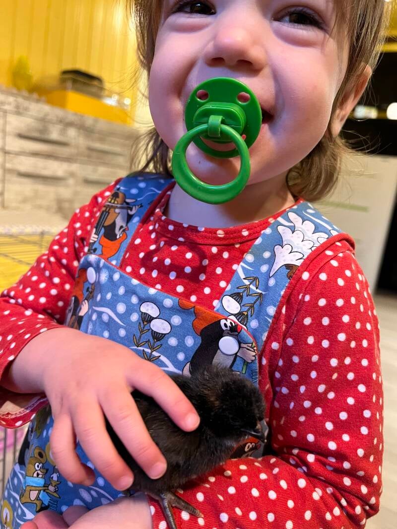 Heute haben wir erst mal alle Küken geknuddelt. An dem Morgen waren alle Küken schon schön flauschig und ganz weich.