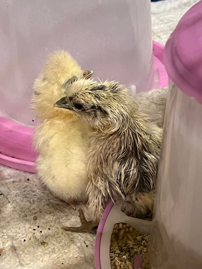 Die geschlüpften Küken waren lange genug im Brüter, um sich vom Schlupf zu erholen und zu trocknen. Nun durften sie in ihr Kükenheim umziehen.