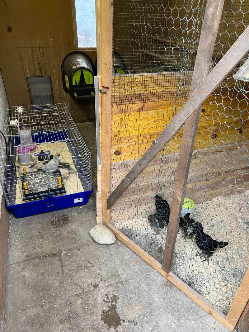 Die Küken ziehen aus dem Keller in den Hühnerstall um.
