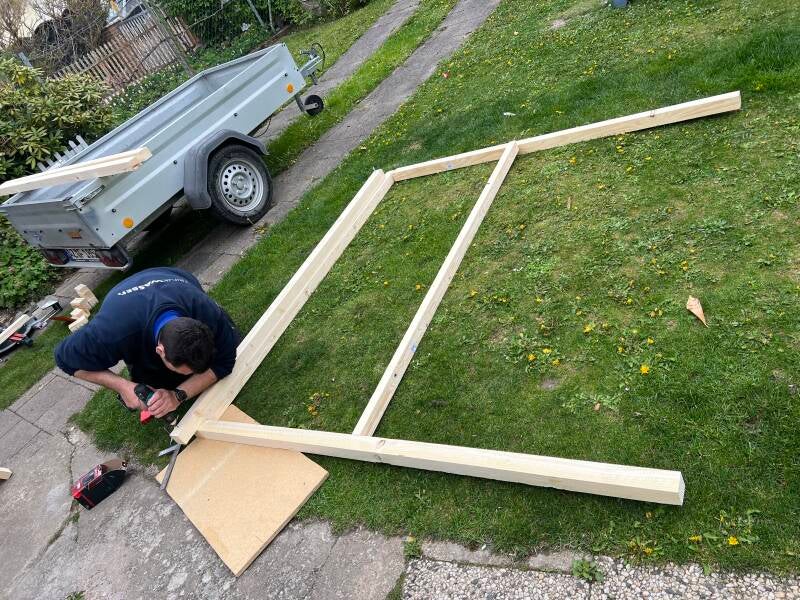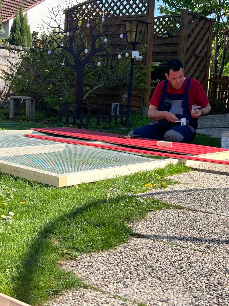 ... das Dach wird montiert und die Seiten werden mit den restlichen Holzpaneelen geschlossen.